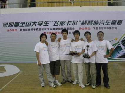 7月23日,小组在指导老师任文举和宋俊杰老师的带领下来到了第四届“飞思卡尔杯”东北赛区的主战场吉林大学。第一天的比赛全场座无虚席。首先进行的是试车,面对着各高校的“武林高手”带着自己的“神兵利器”,再加上不少各学校的参赛队伍多达十几支,“说实话,我们心里有些胆怯”。前几个车队试跑均不是很理想,有的冲出跑道,有的不能跑完全程,接下来上场的是“奋进号”,小组成员静一静心,坦然地擦拭跑道,镇定地启动小车,小车完美地完成试跑,顿时,全场爆发出雷鸣般的掌声。在接下来的正式比赛中,两部小车表现稳定,成功完成赛程,在分赛区比赛中他们取得了光电组一等奖和摄像头组三等奖的好成绩,其中“奋进2号”以东北赛区光电组一等奖的成绩成功晋级全国总决赛。
