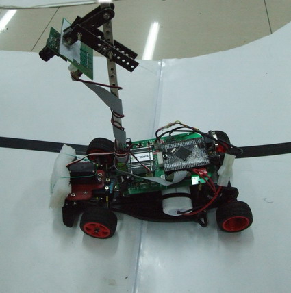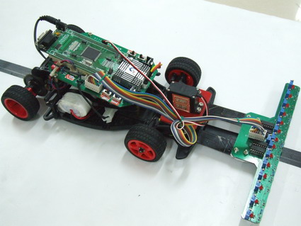 虽说他们全是男孩子,但是在小车制作过程中却显现了这几个大男生的细心之处。在调试过程中小车的电压分配是比较复杂:芯片本身要求的稳压为5伏,舵机电压是7伏,而电源提供的电压为8—10伏,而三者之间的电压搭配需要分压和调压来实现,由于起初的操作不当和分析错误使他们连续烧坏了2块芯片,为了减少费用损失,队员亲自动手完成了112针脚的焊接。舵机的安装也别有一番苦味,由于以前没有接触过,加上机械操纵调整难度大,这一环节成为最耗费时间的过程。他们一次又一次的尝试,不断更改安装方式和臂摆长短试图优化车前轮的转向问题,以适应小车在行进过程中顺利地完成各种弯道的拐弯,负责此结构处理和调整的卢董说:“由于部件的特殊要求,钻孔时需要特别谨慎,距离大了小了均安装不上比赛要求的部件。”几经周折,终于完成了舵机的安装,此时车的基础结构就基本定型了,接下来的工作就是硬件设计和软件程序调试了。硬件主要是由潘宏生和卢董设计完成的, PBC板是有卢董绘制的,由于时间紧张,整个学习和制作过程仅用了一周的时间,电路板上的每一条线都凝聚了他的汗水。程序是小车的灵魂,程序的编写和调试决定了小车的行驶是否快速和稳定,也是最困难的环节, 魏占朋和薛金龙主要负责光电组智能车的程序编写,在参考上届师兄的意见后,完成了新的结构流程图,写成了新的程序。并创造性的加上了电机的PI算法和舵机的PD算法,使小车行驶的更加稳定。